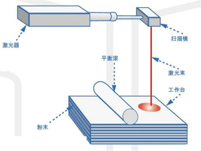 使用高功率激光束將一層金屬粉末加工熔合成型,完成熔合后,操作平臺(tái)下調(diào)一個(gè)層厚的距離,繼續(xù)加工下一層粉末,重復(fù)此步驟,直至劃定(選定的需要加工)的區(qū)域全部熔鑄完成,就得到一件立體的化合物。所需的產(chǎn)品(零件)就是這樣通逐層加工累積而成。